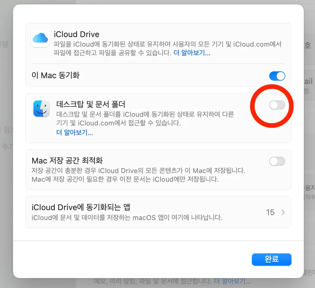 아래 사진처럼 Mac 설정의 iCloud 탭에 들어가서 데스크탑 및 문서 폴더 부분을 끄면된다.