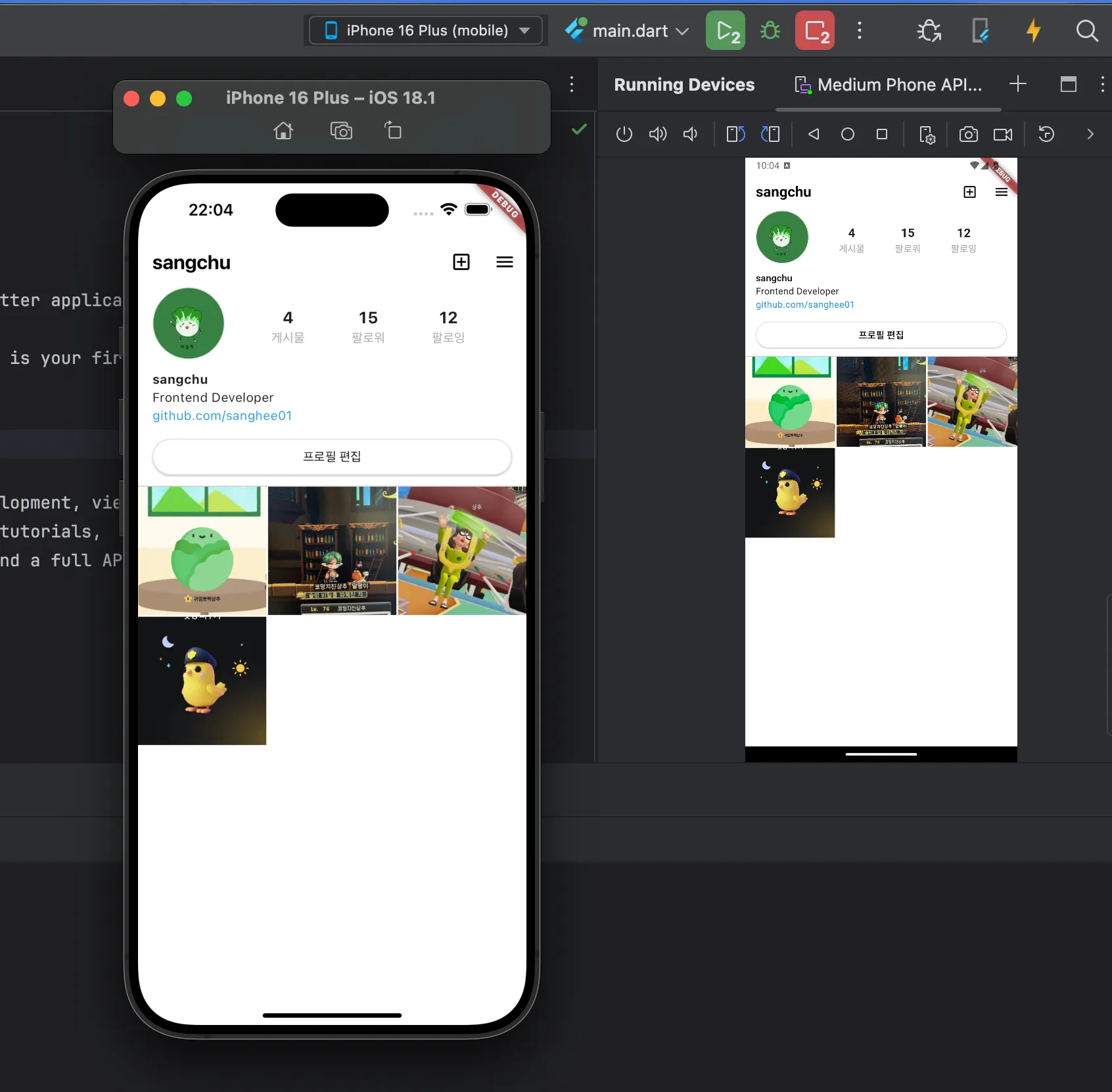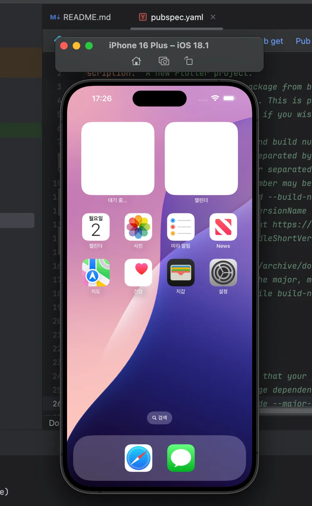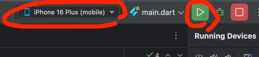 ios 기기 시뮬레이터에서 작업한 프로젝트를 실행시키는 방법은 아래와 같다. ios 기기를 설정하고(나는 아이폰 16 Plus로 했다) 실행시키면 된다. 혹시 시뮬레이터가 안열리는 분은 해당 글을 보면 된다.