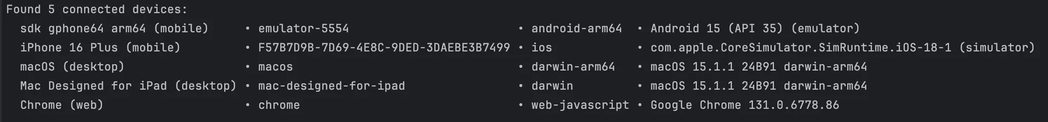 그러니 flutter devices 명령어를 다시 치니까 앞서 안보였던 iPhone 16 Plus 기기가 목록에 생겼다.
