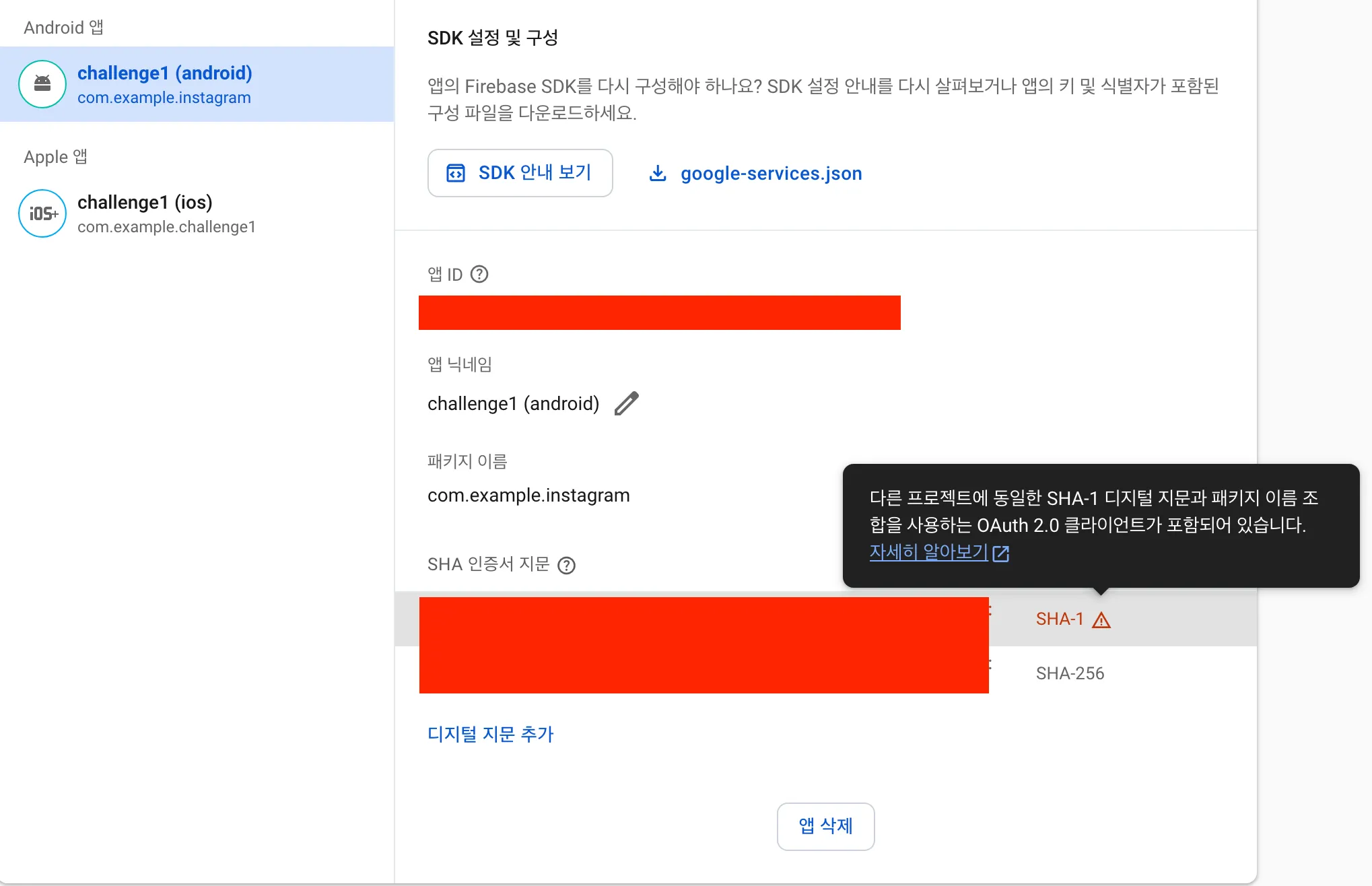 firebase에서 디지털 지문 추가하는 과정에서 "다른 프로젝트에 동일한 SHA-1 디지털 지문과 패키지 이름 조합을 사용하는 OAuth 2.0 클라이언트가 포함되어있습니다 " 문제가 생겼다. 다른 프로젝트에 이미 사용하고 있어서 생긴 문제인 것 같다. 찾아보니 프로젝트별로 SHA 키는 고유해야한다고 한다.