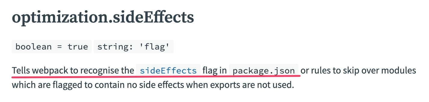 package.json 파일의 sideEffects 플래그를 webpack이 인식하도록 합니다. — webpack 공식문서 중
