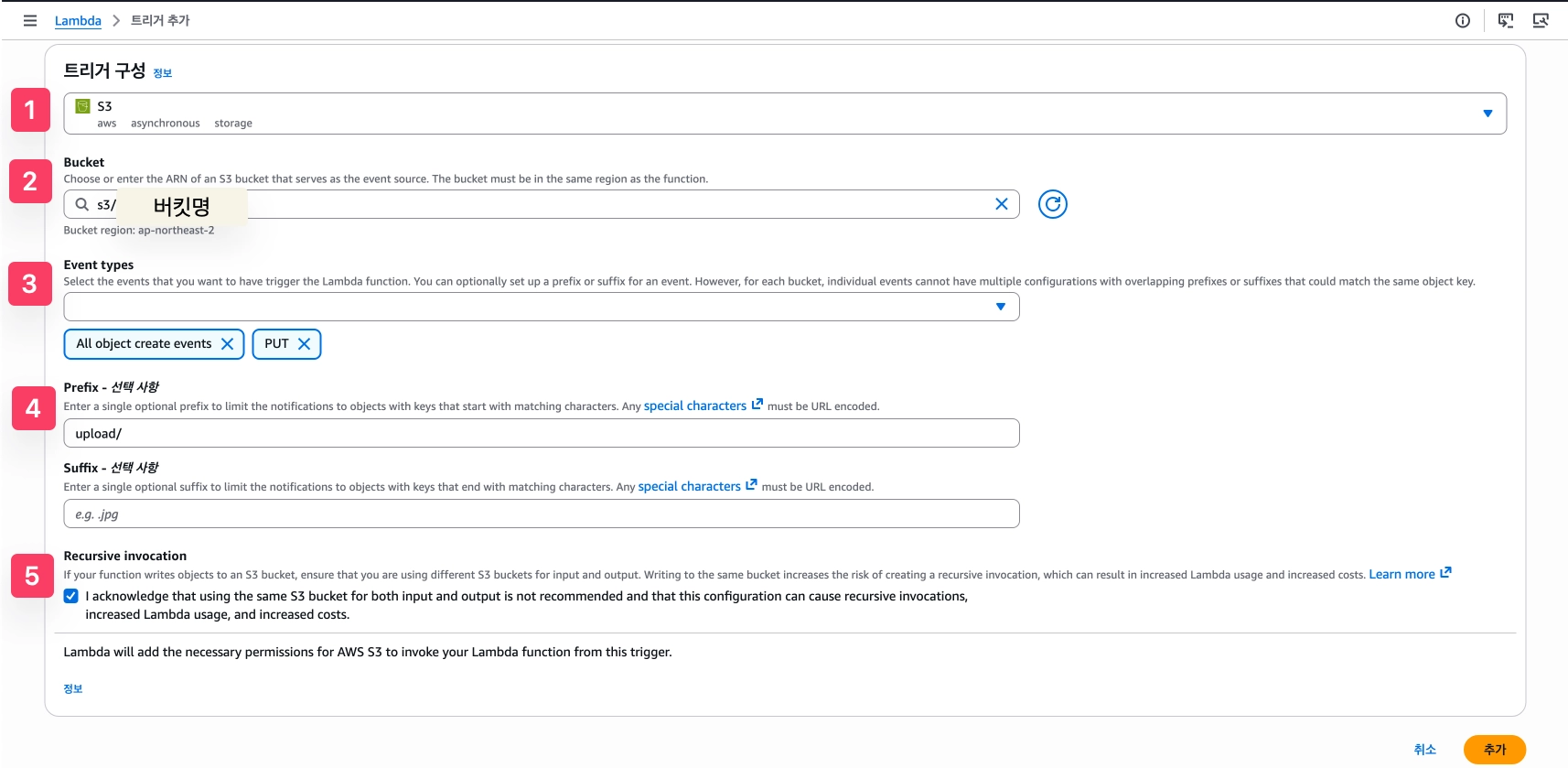 s3:ObjectCreated:\*— PUT을 포함한 모든 객체 생성 이벤트에 트리거 - (4) Prefix: